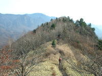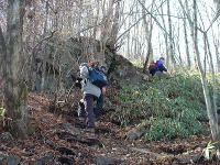 小鳥の飛び交う林 ![]() この日はもうほとんど葉が落ちたナラやリョウブ、カラマツの明るい樹林の中の緩やかな登りの道を歩きます。登山道の落ち葉が歩くたびにカサカサと音を立て、枝々にシジュウカラやコガラなどの小鳥が飛び交っていて、ゆったりした充足感に満たされます。 10分ほど歩くと塩川の支流のひとつの源頭部にでました。そこを回り込むように付けられた道を過ぎると、山頂へ連なる尾根道に出る、急な登りが待っていました。 |