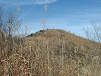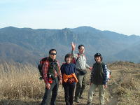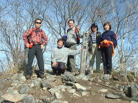 | ピークは4番目 この広いカヤトの原から3回ほどアップダウンを繰り返します。「初めて登った時にはいったいどこが頂上かわからず、3番目くらいのピークできっとここが頂上だろう、と勝手に決めて下りてしまった。」等と失敗談を話しているうち、山梨百名山の新しい標識の建つ頂上に着きました。暖かい陽射しの中、ゆっくりとランチタイムを楽しみ、来た道を戻りました。横尾山は展望が素晴らしく、お薦めの山の一つです。 |