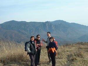 | 正面に迫る金峰、瑞牆 この急登は20分ほどでそれほど長くないので、途中に簡単な休憩を一度入れただけで稜線に出ました。ここで樹林がきれて、正面に山頂の五丈岩が目印の金峰山、大ヤスリ岩が特徴的なゴツゴツした岩肌の瑞牆山が迫っています。その右手には手前に茅ケ岳、その遥か後方の雲の上に富士山が霞んで見えました。さらに視線を巡らすと鳳凰三山、北岳、甲斐駒ケ岳などの南アルプスの峰々が連なっています。小淵沢からは陰になって見えない仙丈ガ岳が見えたのもうれしい。めざす横尾山のその向こうには雪に輝く八ヶ岳が広い裾野を広げてどっしりと横たわっていました。 稜線のはじめは広いカヤトの原で花芽をもったツツジがたくさんあって、ツツジの季節にまた来たいなと思いました。 |