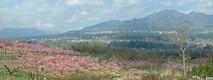 | 4月7日(日) ポレポレクラブ(小淵沢ペンション振興会のウォーキングクラブ)のみんなと新府の桃の里ウォークに行きました。本当は来週が本番なのですが、今年は春が早く、今週も歩くことにしたのです。満開の桃の花の向こうに、茅が岳がかすんでみえました。 (昨年の桃の里ウォークは「風の通り路」22号をどうぞ) |
