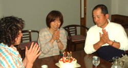 | 6月28日(金) 誕生日です。ペンションたん歩歩の 粟田さんとリィさんがお祝いに、きてくれ ました。ろうそくの数はともかく うれしい! |