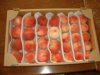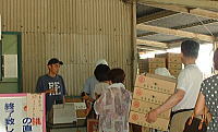 | 8月2日(金) またまた桃の買出しです。桃の空き箱を 4つ持って順番を待っています。(箱代は 200円) きょうの桃の販売は終わり、と言われた のですが、待っているといつもより高いで すが,出荷する予定の桃を出してくれまし た。(普段は完熟の、もう出荷できない桃 を安く売っているのです。) |