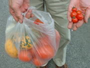 | 9月8日(日) 小淵沢はもうすっかり秋の気配です。散歩に出かけると、おとなりの正美さんが、育てているイタリアントマト、ズッキーニ(丸い形のもの、初めて見ました。)ミニトマトを、畑から採ってくれました。 さっそく、トマトソースにして、料理に使おうと思います。缶詰などとは全然味が違います。 ミニトマトは歩きながら食べました。甘い!! |