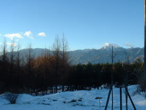 | 12月23日(日) 金曜日にふった雪で 風路の庭も真っ白です。 甲斐駒ケ岳も下の方ま 白くなりました。 |